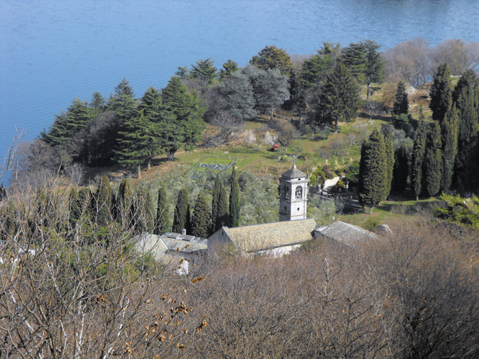 Passiamo a lato della chiesa di San Carlo ignorando l'indicazione stradale per l'abbazia, continuiamo sul sentiero n.7 per via Roccolo e superate alcune ville iniziamo il cammino sulla dorsale della penisola di Piona. Le tracce dei sentieri si confondono tra muretti a secco e panorami mozzafiato per poi congiungersi nei pressi della falesia del Sass Negher (365 m), una maestosa parete rocciosa attrezzata per l'arrampicata sportiva. Procediamo sul sentiero n.7 scendendo dolcemente verso la riva del lago, superata una grotta votiva costeggiamo una rete metallica fino all'entrata dell'abbazia. Dopo una visita all'Abbazia di Piona (220 m) riprendiamo il cammino sul largo stradone acciottolato, superato l'agriturismo Malagrida troviamo le indicazioni per salire all'Olgiasca (sentiero n.7A). Facciamo attenzione a non perdere la traccia tra i vicoli del borgo e quando ritroviamo la chiesa di San Carlo transitiamo sul percorso fatto in precedenza per la via del ritorno.